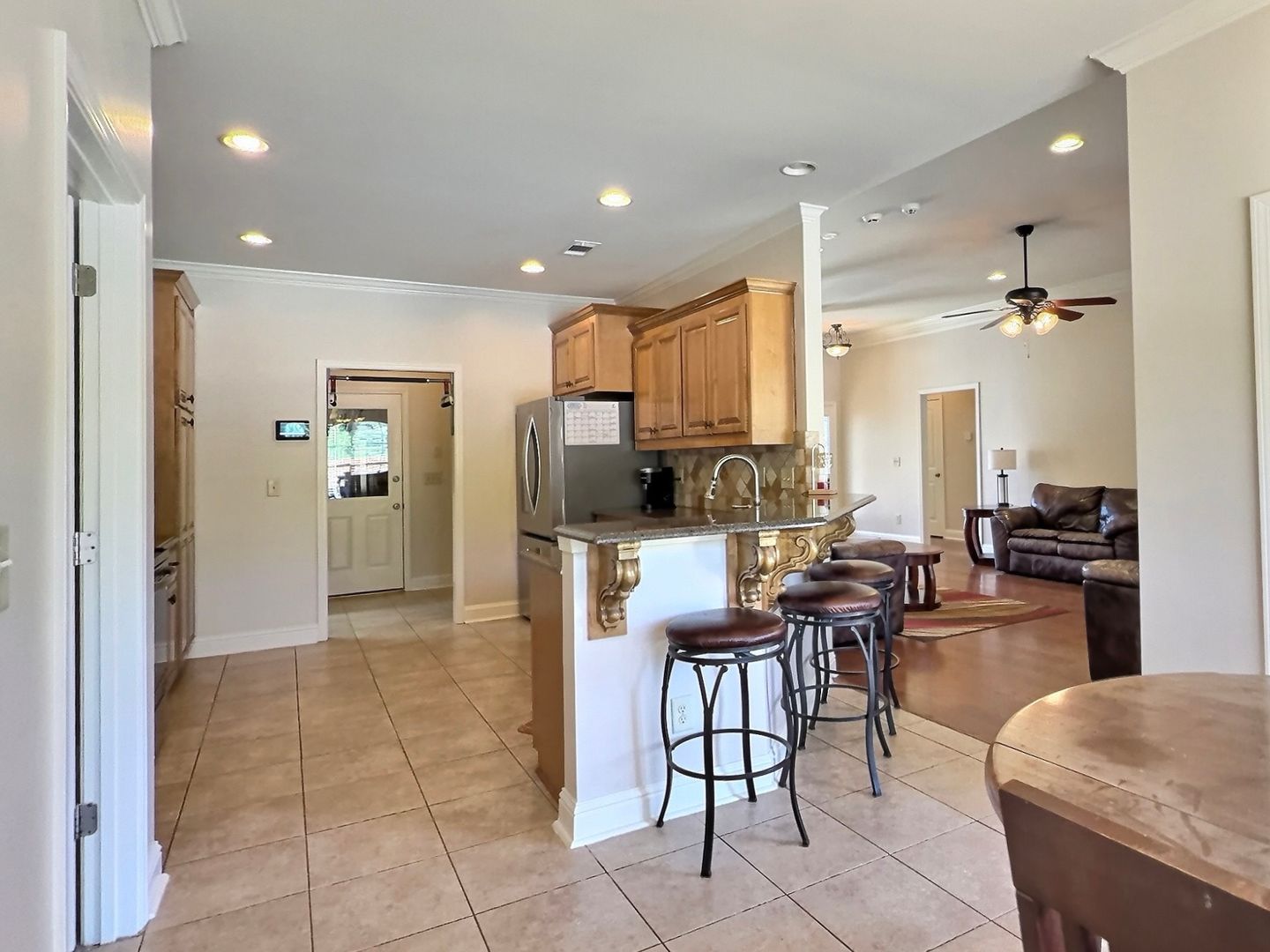 Inside, the home impresses with soaring 12-foot ceilings and a thoughtfully designed layout. The formal dining room is highlighted by a large arched window, filling the space with natural light. The open-concept kitchen flows seamlessly into the breakfast area and features granite countertops, a breakfast bar, and ample cabinetry—perfect for everyday living and hosting alike.